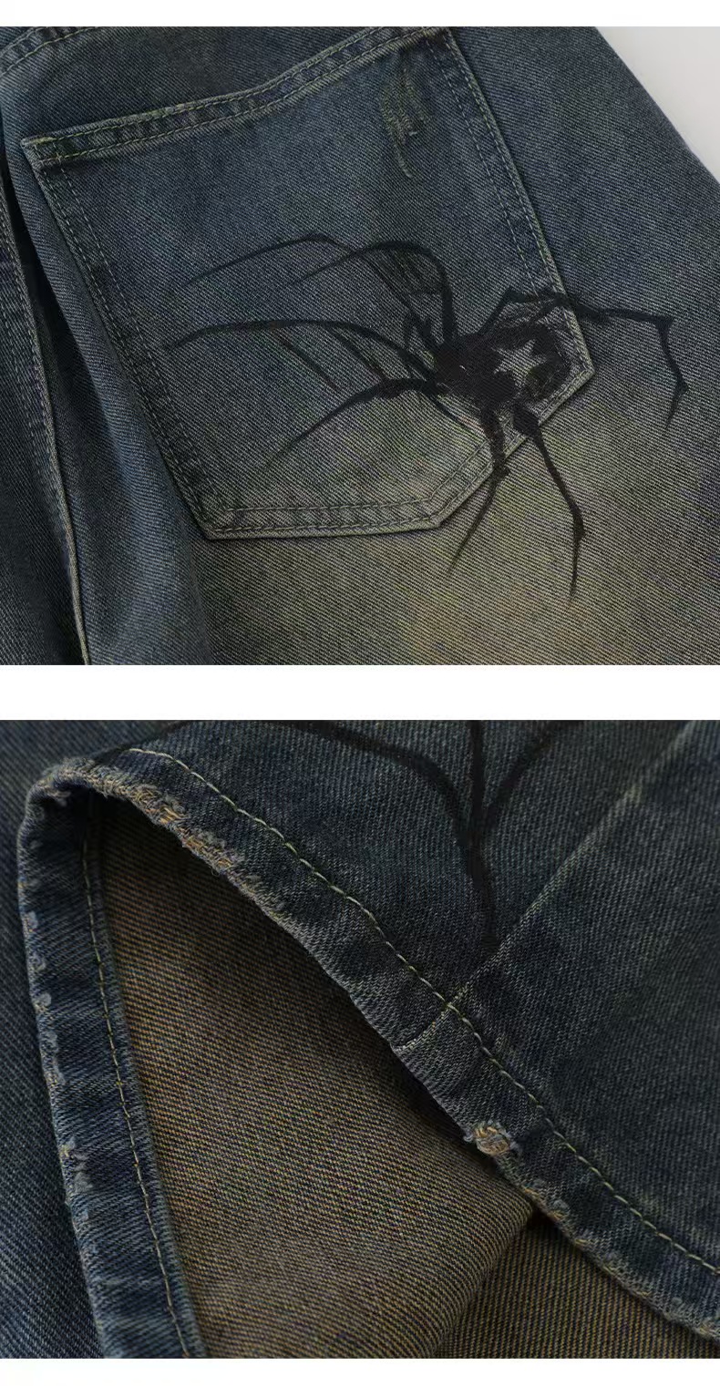 Standout Design with a Clean FinishThese men’s denim shorts combine a relaxed straight-leg fit with striking printed detail, creating a product that feels distinctive without being overdone. The pale vintage wash serves as a clean canvas for the black spider-web graphic printed across the front and rear panels. Unlike distress-heavy shorts, this design opts for structure over destruction, giving it a polished but edgy personality. The relaxed shape allows for natural movement without bulk, and the mid-thigh length adds practicality to everyday wear. This is a ready-made solution for fashion-forward buyers seeking custom jeans that balance novelty with wardrobe function.